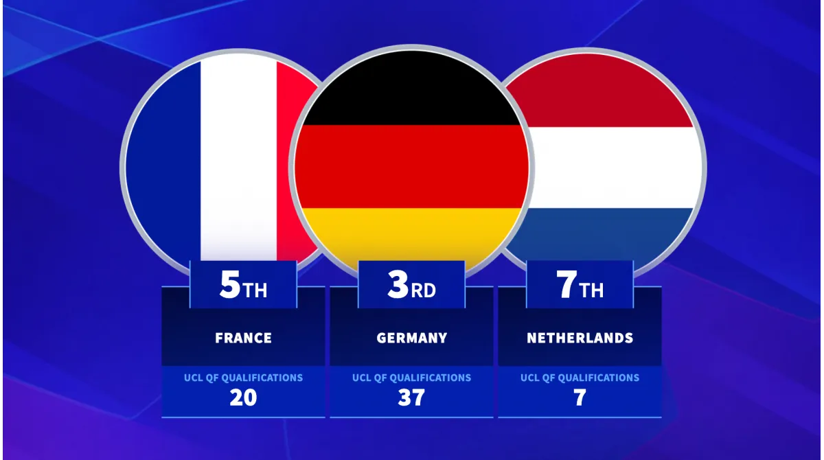 وتلتها إيطاليا في المركز الرابع بـ37 ظهوراً لأندية الكالتشيو في دور الثمانية منذ موسم 1992/1993، بينما حلت فرنسا خامساً بـ18 مشاركة لأندية الدوري الفرنسي.
